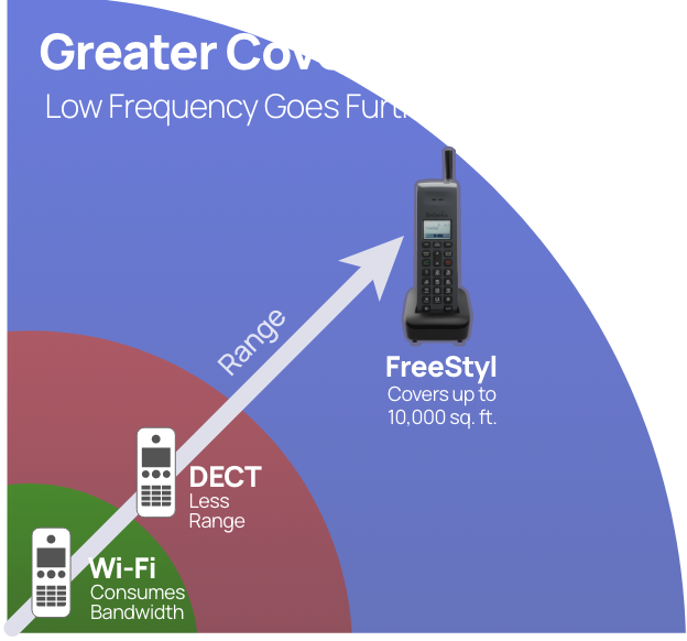 The FreeStyl phones uses the 900Mhz Frequency allowing signal to travel further and penetrate obstacles easier. Couple With transmission power just under 1,000 mW, the DuraFon output is 3 to 5 times the output transmission power of Wi-fi or Dect phones allowing the longest range of any cordless phone.