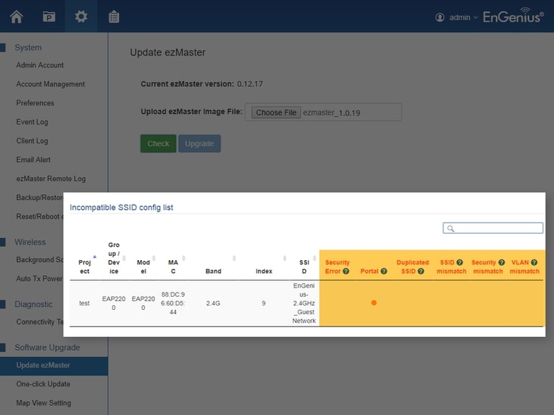 2-1. Vai a ezMaster > Impostazioni globali> Aggiorna ezMaster, carica il file di aggiornamento ezMaster v1.0 (c1.9) e fai clic sul pulsante “Verifica” per scoprire gli APs con impostazioni SSID non corrispondenti..