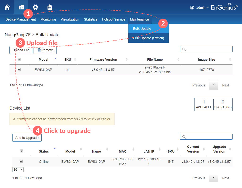 | Opzione 2 – Aggiornamento con un solo clic: Scarica e installa automaticamente il firmware direttamente dal “EnGenius FW Server” |