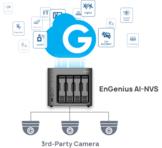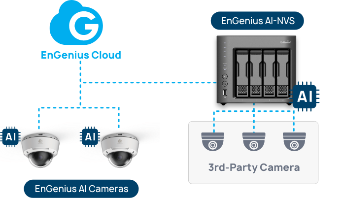 Bring all your surveillance devices under one centralized platform. With our NVS, legacy and non-EnGenius cameras can be seamlessly connected to the EnGenius Cloud. This unified approach ensures consistent AI performance across your entire network while simplifying system management and maintenance.