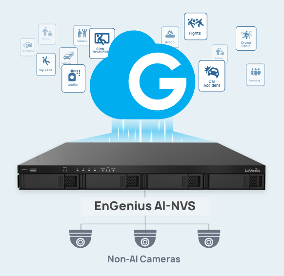Transform your non-AI (ONVIF) cameras with advanced AI capabilities. Our AI-powered NVS adds intelligent detection and analysis to your current surveillance system, delivering the same smart capabilities as EnGenius AI cameras without replacing your existing cameras.